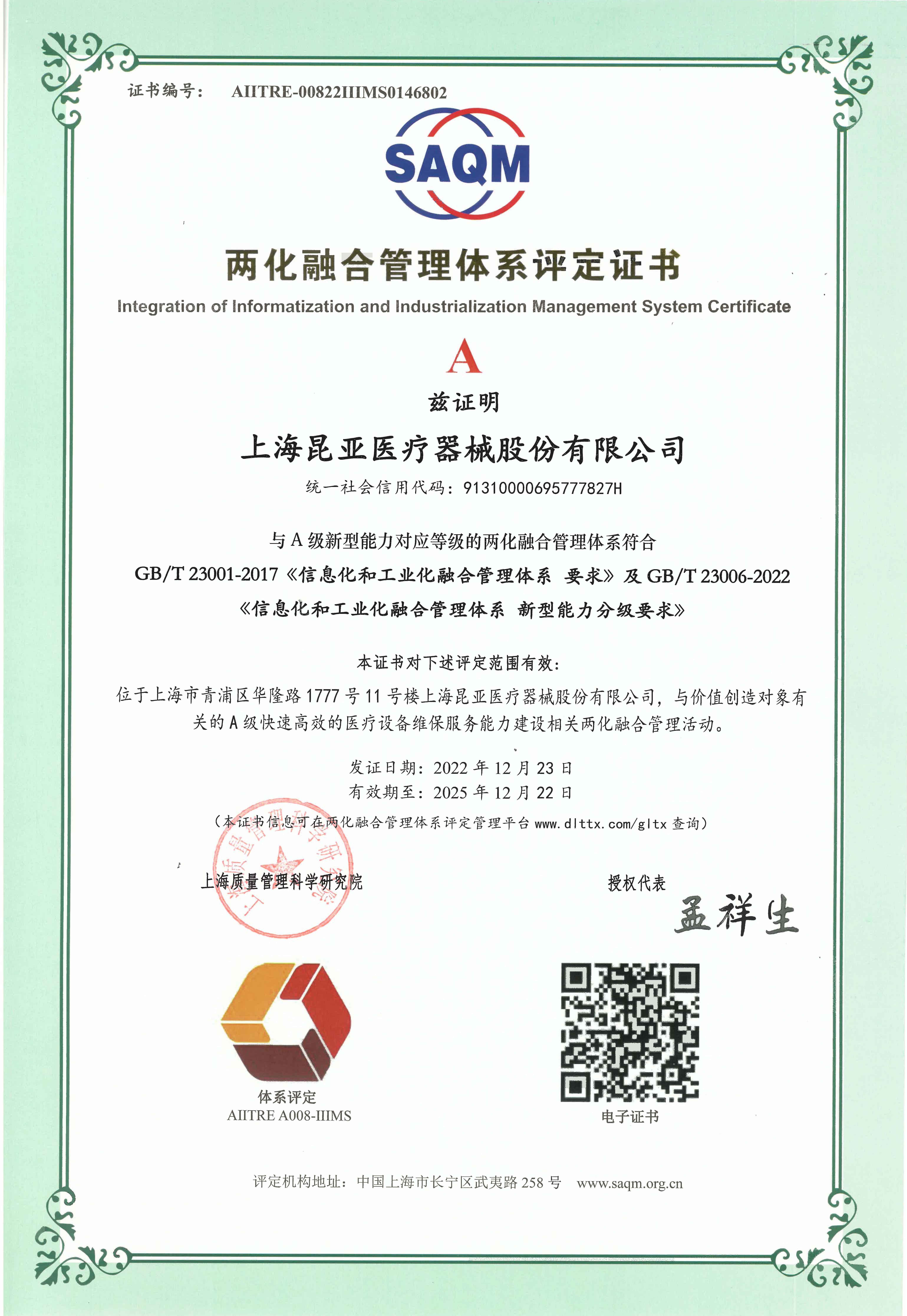 兩化融合管理體系評定證書